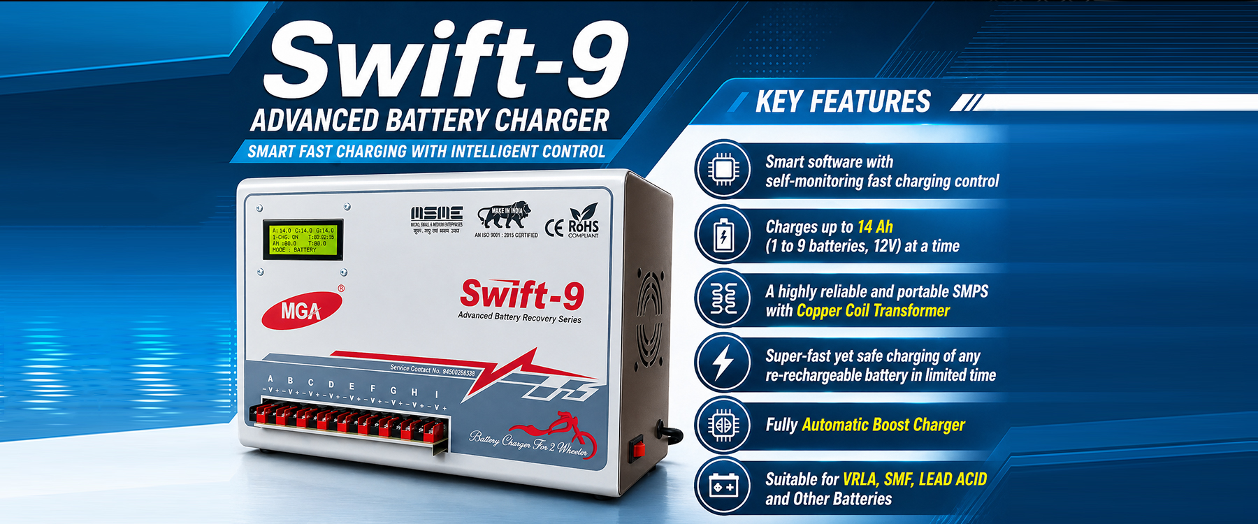 Modern Battery chargers which applicable on charge all Automotive batteries, SMPS Batteries, VRLA Batteries, TUBULAR Batteries, Inverter Batteries etc. with automatic cutoff and inbuilt Turbo charge features. Our motto has always been Customer Delight through Innovation & Passion with the focus on Execution & Team-work. At MGA, we passionately innovate to make life comfortable and efficient. Incepted in the year 2002 at Lucknow, (Uttar Pradesh, India) ..